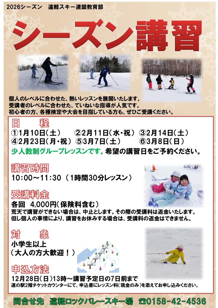 2026シーズンのスキーレッスン(遠軽スキー連盟教育部主催)のスケジュールが決まりましたのでお知らせいたします。