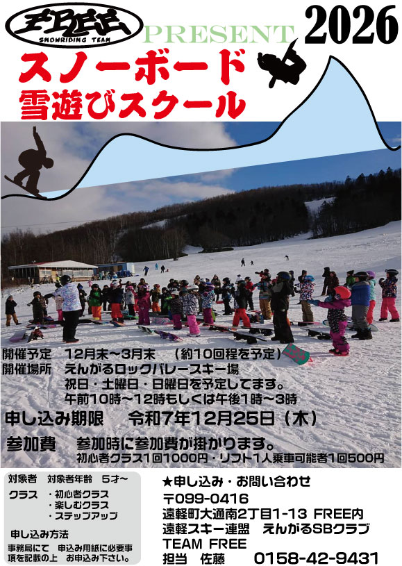 2026シーズンのスノーボード雪遊びスクール(遠軽スキー連盟えんがるSBクラブ主催)のスケジュールが決まりましたのでお知らせいたします☆