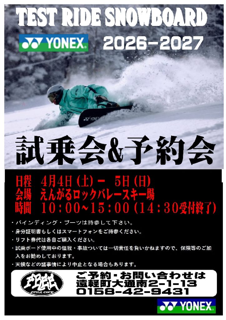 4/4(土)・5(日)、下記の通り、スノーボード試乗会が開催されますのでお知らせいたします。