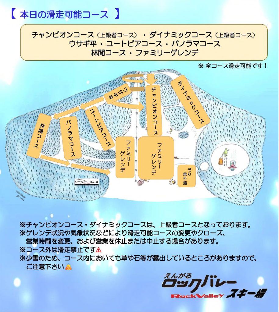 なお、気温によってゲレンデの状況が大きく変動しますので、上記の予定から変更となる場合があります。